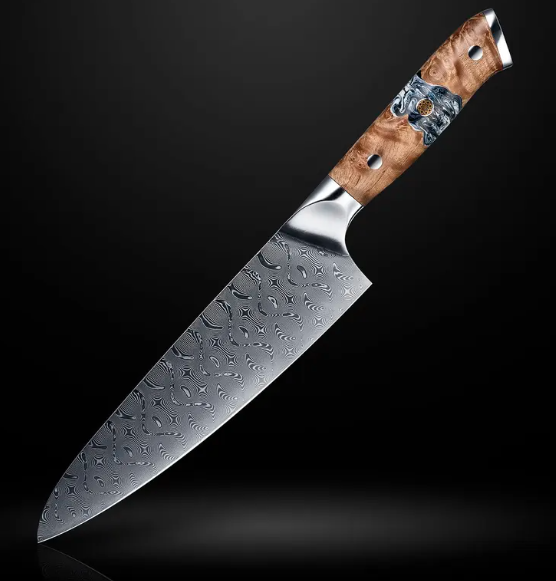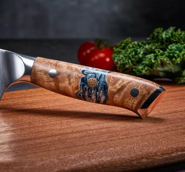 The Tenjin Chef’s Knife combines the natural beauty of burl wood with a reinforced resin pattern, creating a one-of-a-kind handle that’s both striking and durable. No two handles are ever the same, ensuring every knife is as unique as its owner.