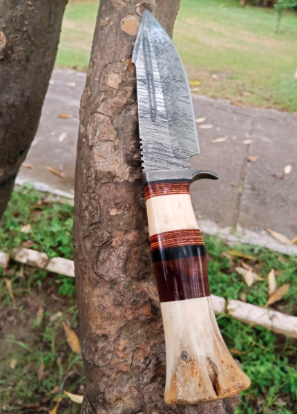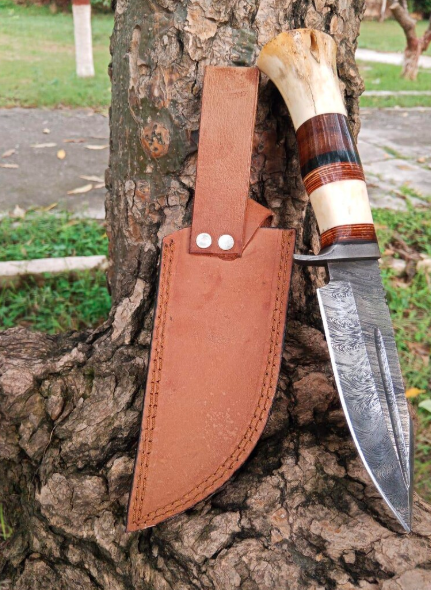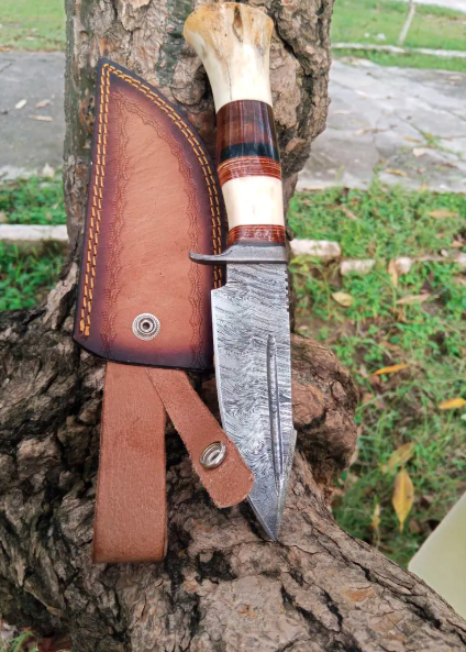 BoneWoodHandle,Ergonomically designed for comfort, style, and a secure grip, featuring a harmonious blend of natural bone and rich hardwood and leather pure Handcrafted Excellence: Full tang construction ensures maximum strength, premium materials guarantee durability, and meticulous attention to detail reflects the artisan’s passion- Perfect for: Hunting, Camping, Bushcraft, Outdoor Survival, and discerning collectors who appreciate the finer things in life Includes: Custom hand-stitched leather sheath for safe carrying and storage, crafted with the same attention to detail as the knife itself .A true masterpiece for outdoor enthusiasts and collectors alike, this knife is a testament to the art of handcrafted excellence “