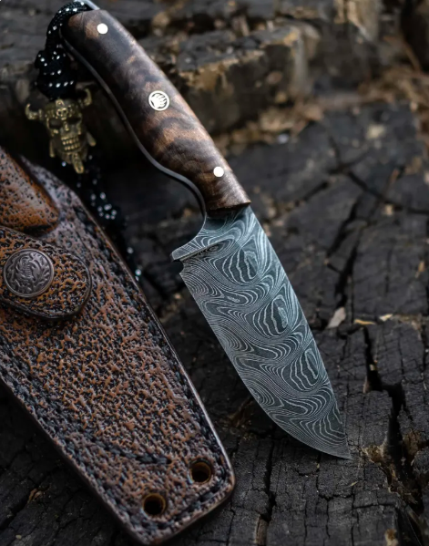Find the perfect companion for your camping and hunting trips with our uniquely crafted everyday knife. This stunning piece combines a razor-sharp edge with an eye-catching handle, offering both durability and style.