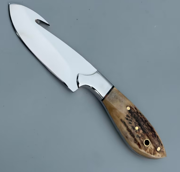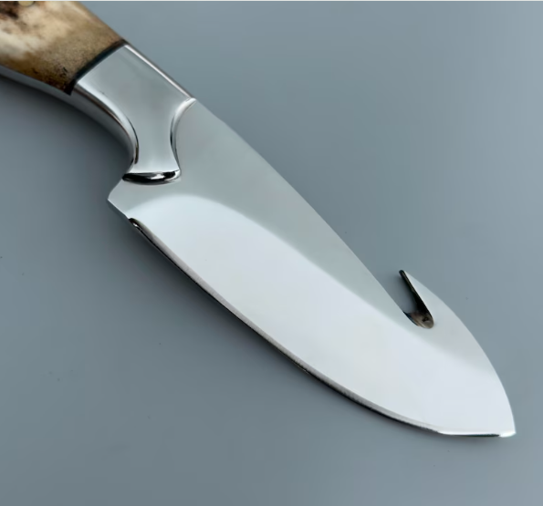 Gut Hook Hunting Knife – Elk Antler Handle | 8″ Total Length | J2 Steel High-Polish Blade | Leather Sheath Included