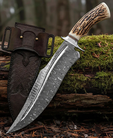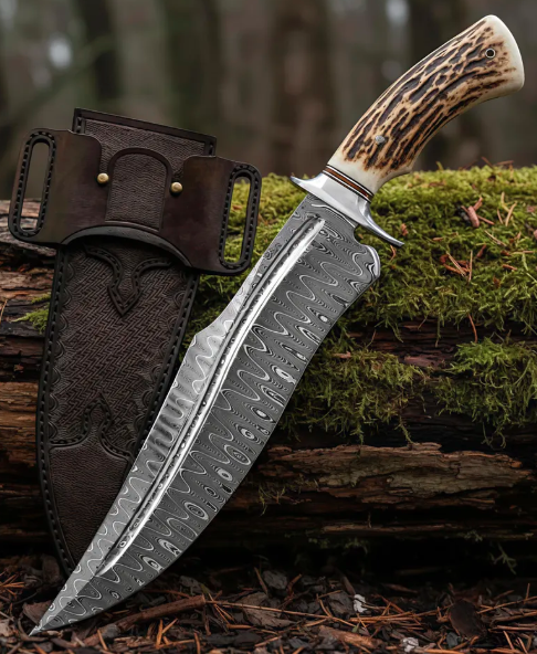 This is a stunning, handcrafted Damascus Steel Bowie Knife perfect for the collector, hunter, or outdoors enthusiast.