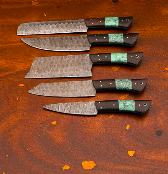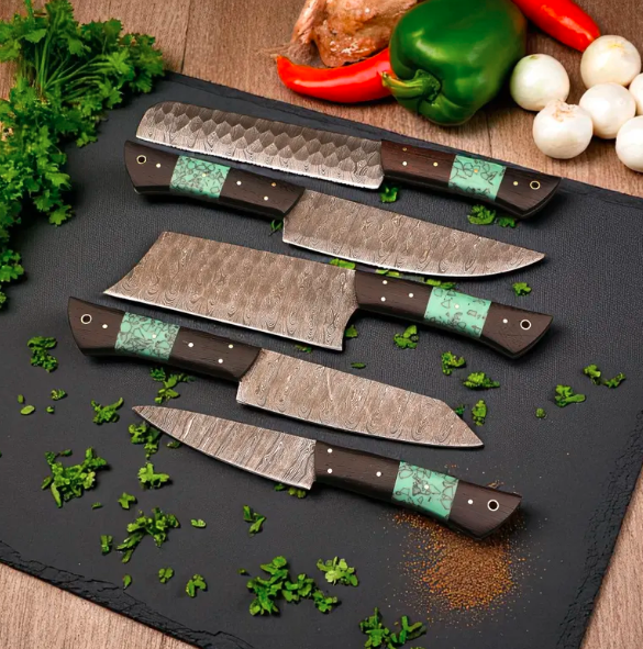 Discover premium craftsmanship with this 5 Piece Handmade Damascus Chef Knife Set by AB Gill Crafts — a stunning blend of beauty, strength, and precision. Each knife is forged from high-carbon Damascus steel and features a unique wenge wood and resin handle, offering durability, comfort, and style.