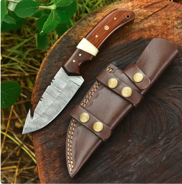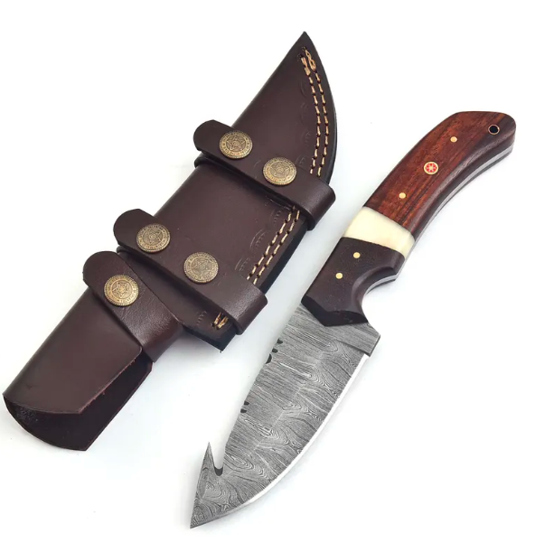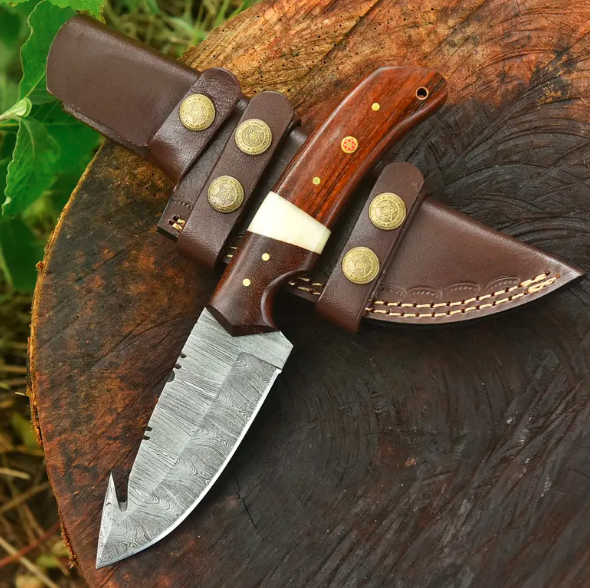 Handmade Damascus Steel Hunting Knife – 9” Gut Hook Blade with Bone & Rosewood Handle + Leather Sheath – Outdoor Gift Knife Groomsmen GiftHandmade Damascus Steel Hunting Knife – 9” Gut Hook Blade with Bone & Rosewood Handle + Leather Sheath – Outdoor Gift Knife Groomsmen Gift
