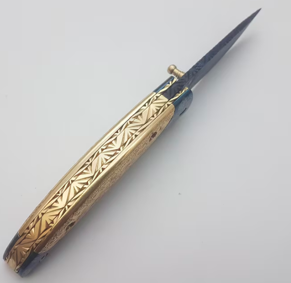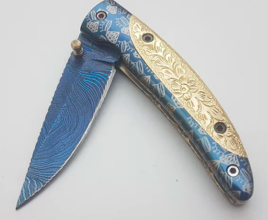 Handmade Folding Knife | Blue Titanium Damascus Blade | Hand-Carved Brass Handle |Box & Leather SheathHandmade Folding Knife | Blue Titanium Damascus Blade | Hand-Carved Brass Handle |Box & Leather Sheath