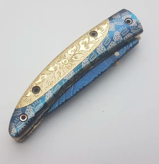 Experience precision, beauty, and strength in one exquisite design. This handmade liner lock folding knife features a titanium-coated blue Damascus blade and a fully hand-carved Brass handle, showcasing both luxury and functionality. Perfect as an EDC knife, collectible gift, or premium outdoor companion.