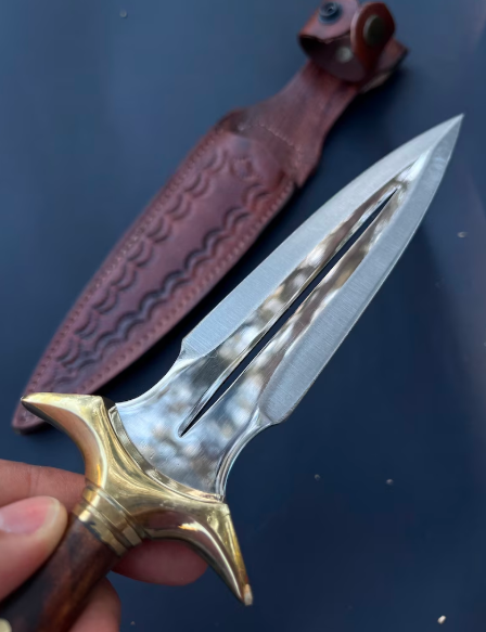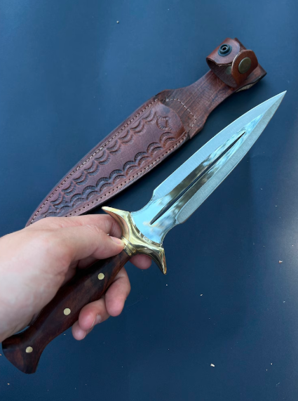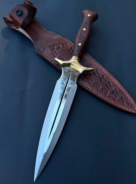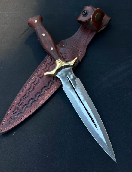 This walnut handle hand crafted double-edged dagger knife is the epitome of both form and function, designed for collectors and enthusiasts alike. With its sharp, stainless steel blade and tapered point. The ergonomic handle offers a secure grip, making it a stunning piece of art. Whether you’re expanding your tactical collection or seeking a versatile tool, this dagger stands out for its balance of elegance and practicality.